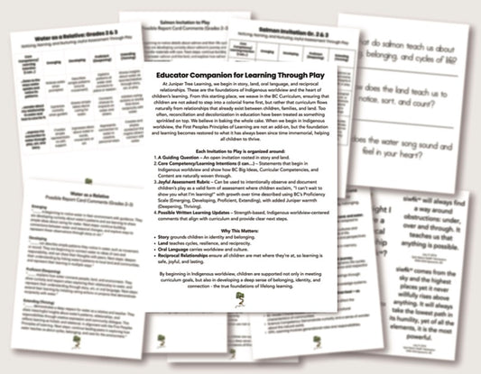 Curated, land-based learning experiences that invite children to explore, wonder, and create by sharing the stories that live inside of them through play (and share them orally before ever putting pencil to paper), to connect more deeply to culture and their identity, and nurture and deepen reciprocal relationships with the land and all living things. Contact us for a free 15 minute Discovery Call to explore creating a customized Invitation to Play that is responsive to the unique needs and goals of your community.